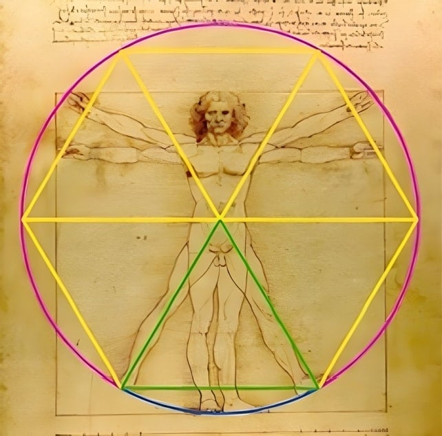 Leonardo da Vinçi öz qeydlərində maraqlı bir detal qeyd etmişdi: “Əgər ayaqlarını ayırsan və qollarını başının səviyyəsinə qədər qaldırsan, ayaqlarının arasında qalan boşluq bir bərabərtərəfli üçbucaq əmələ gətirir.” Sweeney bu ifadəni riyazi cəhətdən araşdırdıqda, ayaqların açılma bucağı ilə göbəyin hündürlüyü arasındakı nisbətin 1,64 ilə 1,65 arasında olduğunu aşkarladı. Bu dəyər, müasir elmdə “tetraedrik nisbət” kimi tanınan 1,633 ədədinə demək olar ki, tam bərabərdir.
